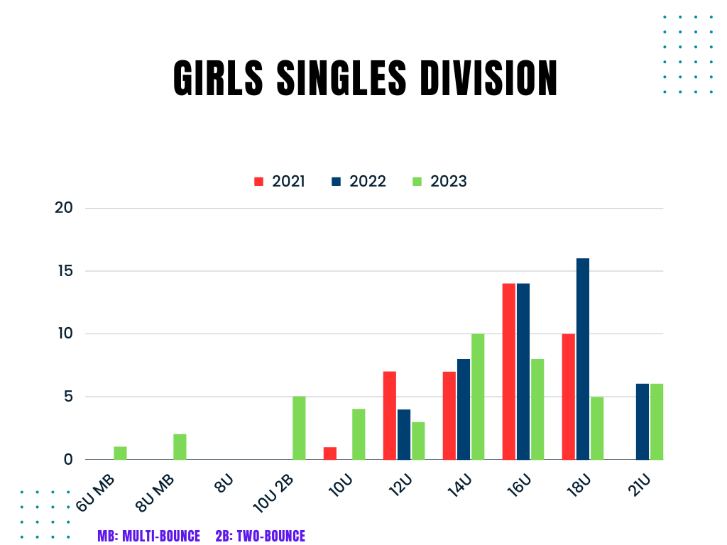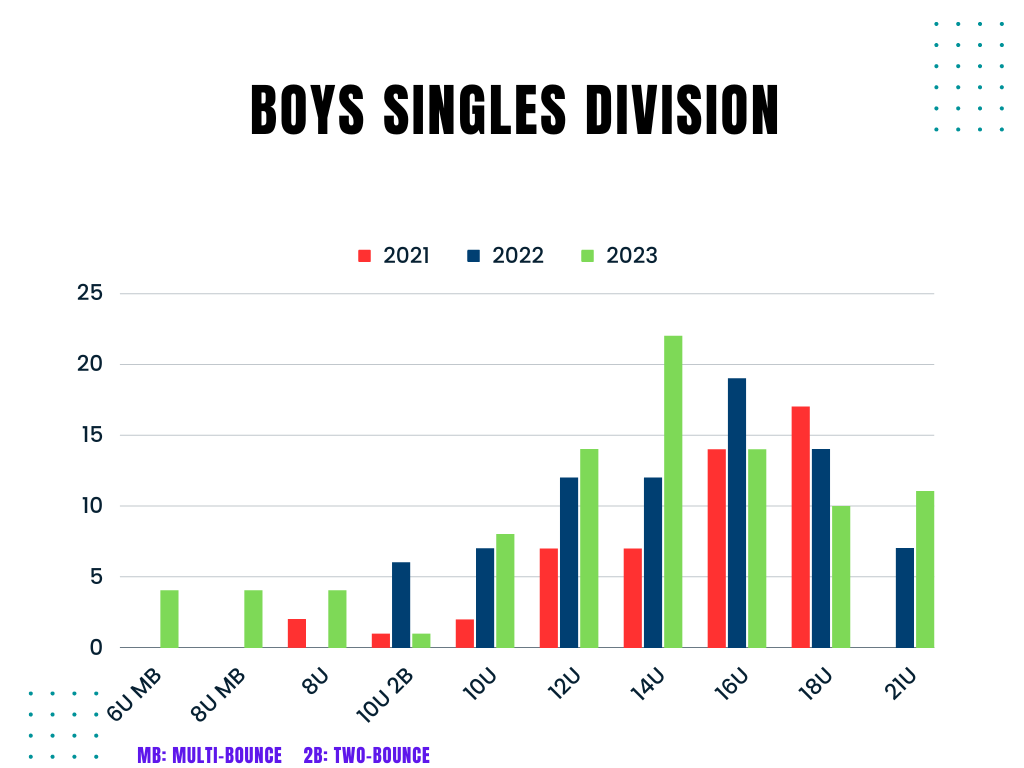 One of the most inspiring things about the Junior Nationals was seeing the dedication of the parents who were there to support their children. They were there to cheer them on, offer advice, and help them through difficult matches. 111 (one-hundred-and-eleven) players competed in the 2023 Junior Nationals Racquetball Championship and the good news is that the trend has been rising steadily. Here’s couple of charts depicting the growth since 2021: